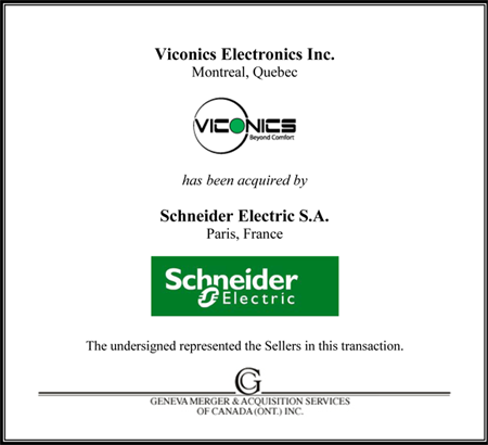 June 15, 2011 Viconics Electronics is acquired by Schneider Electric. Schneider Electric, a global specialist in energy management, has acquired the assets and daily operations of Viconics Electronics Inc. of Québec, Canada. "Given our long history and successful partnership with Schneider Electric, we are extremely excited to join forces with a global leader in energy management," said Louis Viglione, founder of Viconics. As with Schneider Electric, our products are proven to deliver energy efficiency. In fact, they are highly complementary, and it would be difficult to imagine a better fit. I would sincerely like to thank all our customers for their support over the last 30 years." "At Schneider Electric, we're focused on providing best-in-class products and complete solutions for managing the world's energy," said Michel Ramser, vice president, Offer Management for the Buildings Business of Schneider Electric. "With the acquisition of Viconics, we've added a premier, easy-to-apply, energy-saving, retrofit product line to our portfolio. And for our new customers from Viconics as well as our existing customers, we look forward to leveraging a more complete range of energy management solutions." | |